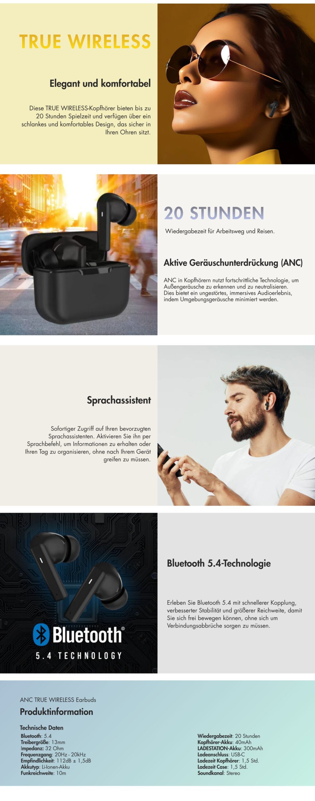 Erleben Sie die ultimative Mischung aus Stil und Leistung mit den True Wireless Stereo Kopfhörern im Stem-Stil – perfekt für alle, die ein schlankes Design und kraftvollen Sound suchen. Mit müheloser Bluetooth-Verbindung, Touch-Steuerung für Titel, Anrufe und Lautstärke sowie dem zusätzlichen Vorteil der aktiven Geräuschunterdrückung (ANC) für ein fesselndes Audioerlebnis.