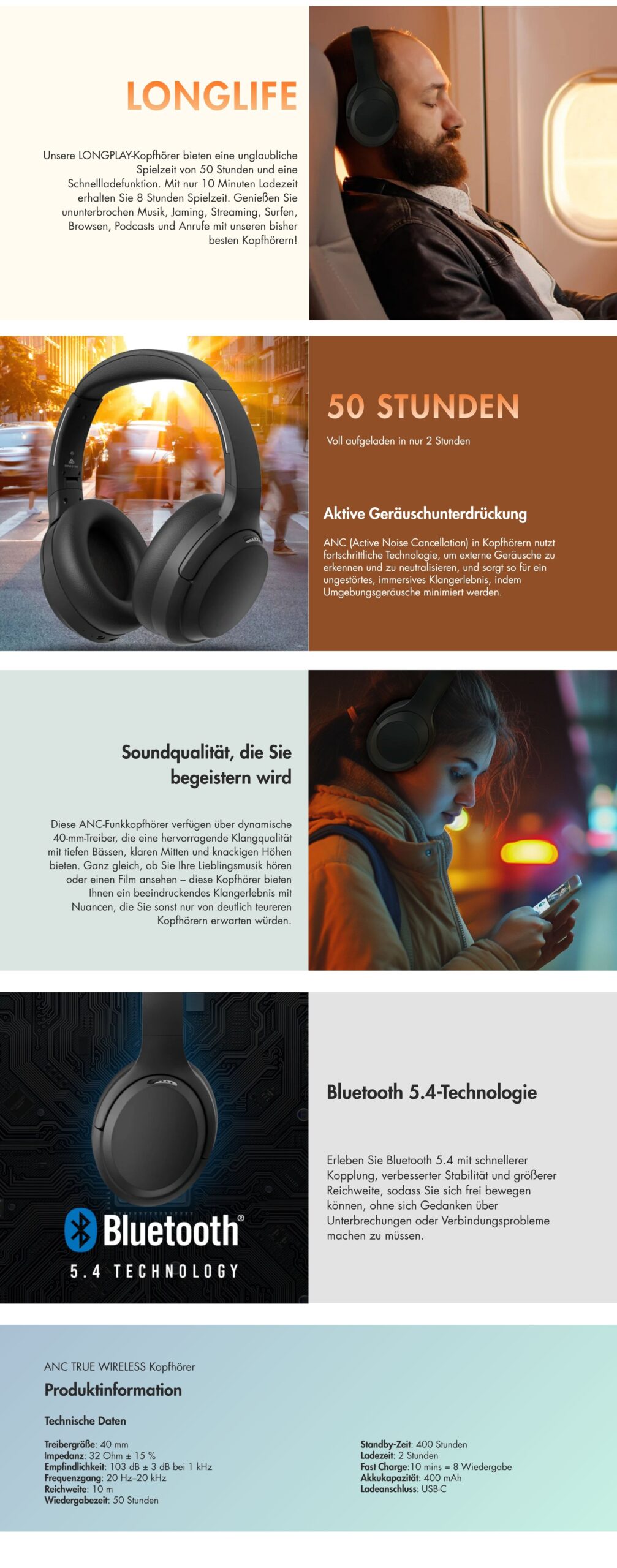 Wenn Sie eine Nachteule sind und länger aufbleiben als der Rest des Hauses, dann brauchen Sie ein gutes Paar hochwertiger kabelloser Kopfhörer, die sich problemlos mit Ihrem Fernseher oder Smart-Gerät verbinden lassen. Diese Kopfhörer wurden speziell für den kabellosen Betrieb mit den meisten modernen Fernsehern über Bluetooth entwickelt. Falls Ihr Fernseher kein Bluetooth hat, liefern wir ein superlanges 4 m langes 3,5-mm-Audiokabel mit, das Sie an den Kopfhörerausgang Ihres Fernsehers anschließen können.