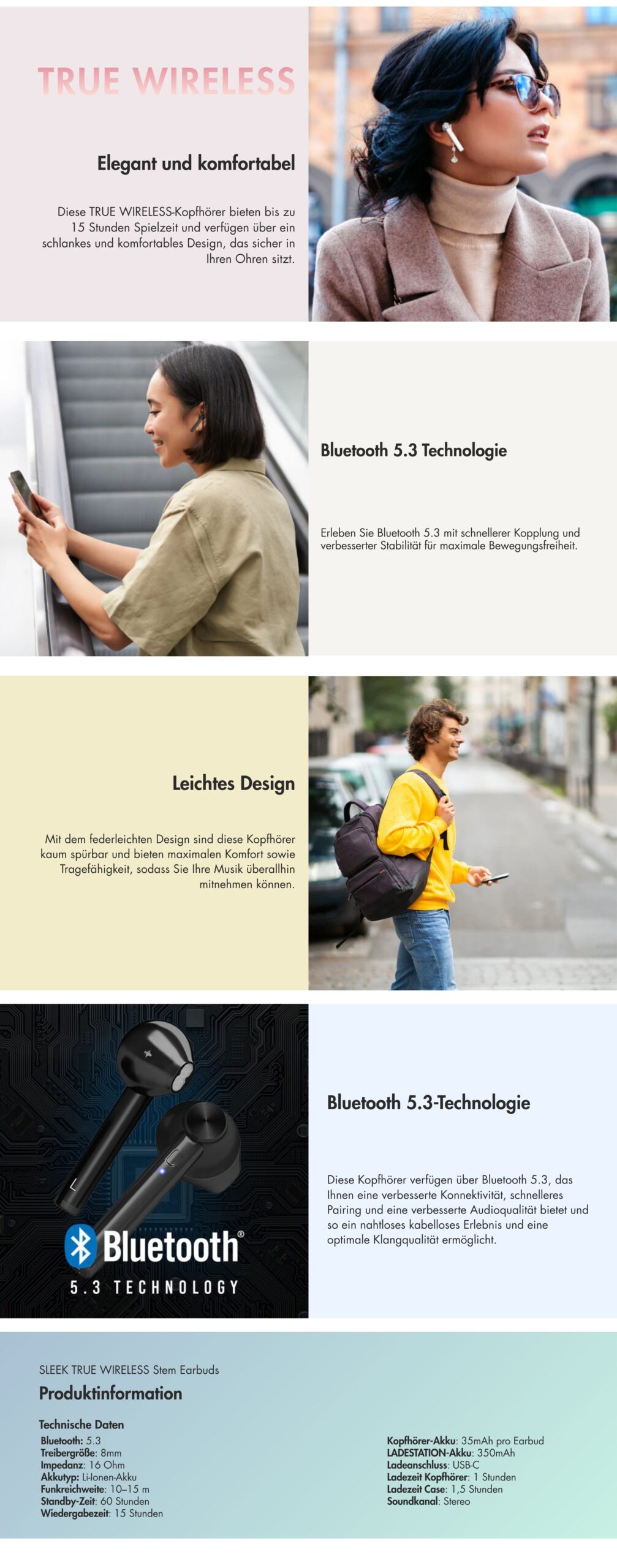 Diese SLEEK TRUE WIRELESS Stem Earbuds sind ideal für alle, die ein schlankes, kompaktes Design mit kraftvollem Sound suchen. Das TWS-System verbindet sich mühelos mit Ihrem Bluetooth-Gerät und bietet eine bequeme Steuerung von Titeln, Anrufen und Lautstärke durch einfaches Tippen.