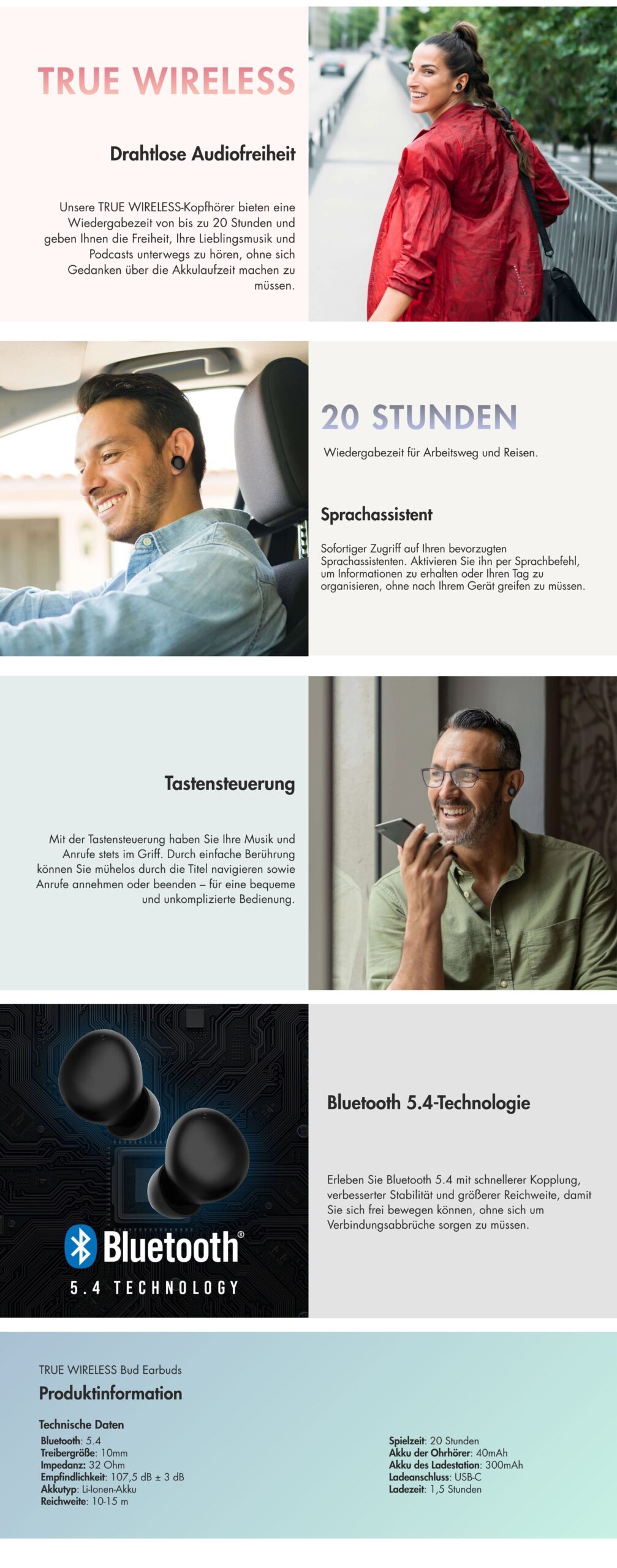 Schalten Sie den Alltag aus und tauchen Sie mit den TRUE WIRELESS Bud Earbuds in Ihre ganz persönliche Klangwelt ein! Freuen Sie sich auf eine Akkulaufzeit von 20 Stunden, Bluetooth 5.4-Konnektivität und praktische Tastenbedienung für ein ungestörtes Musikerlebnis. Die Ladestation eignet sich ideal zum Aufladen für unterwegs.